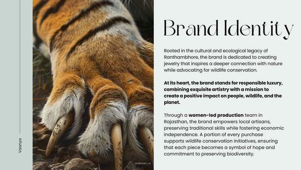 Vaanya is a personal and poetic collection that bridges the human and natural worlds. Inspired by the landscapes of Ranthambhore and rooted in a family legacy of tiger conservation, the collection draws from Mughal and Rajputana design traditions while embracing contemporary forms. Each piece becomes a talisman — echoing the rhythms of the forest, the grace of wildlife, and the quiet power of nature. Vaanya speaks to a deeper connection between the universe and the self, where heritage meets responsible luxury.